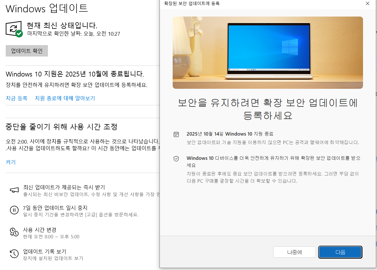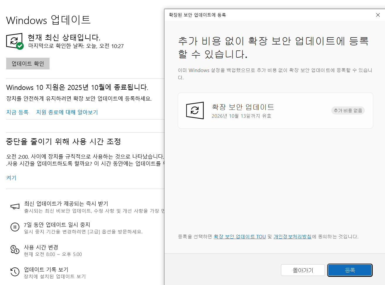 - '확장된 보안 업데이트에 등록' 마법사 창이 열려요